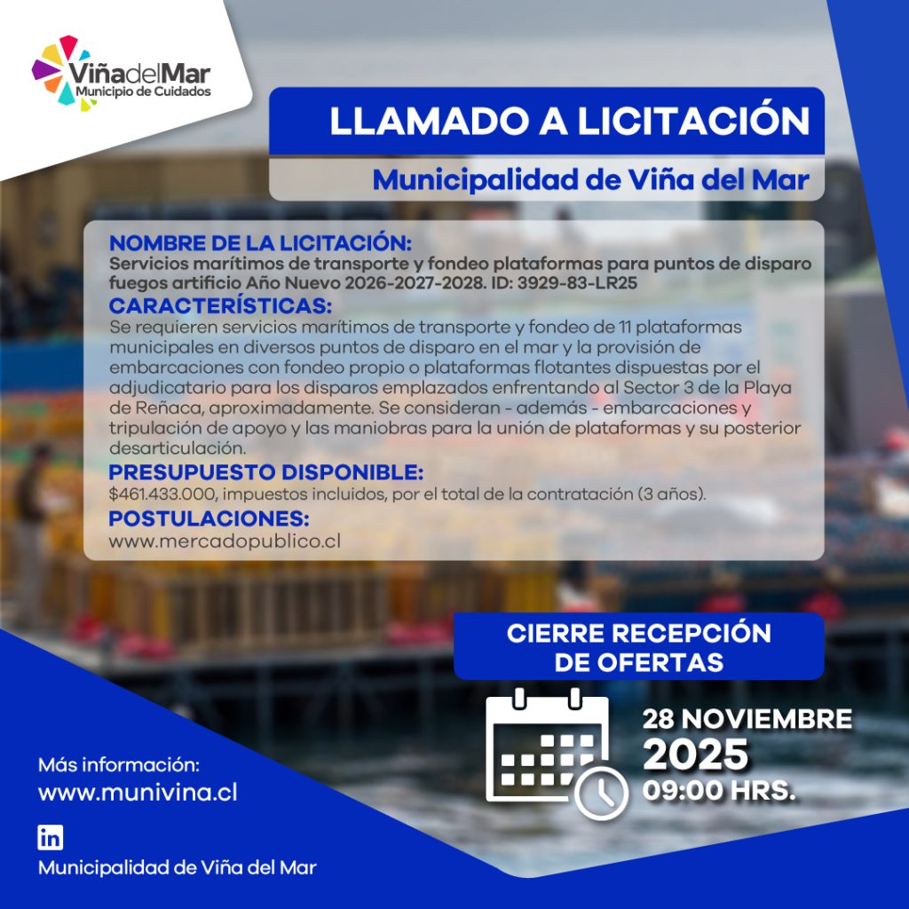 LICITACIÓN PREVISIÓN DE SERVICIOS MARÍTIMOS DE TRANSPORTE Y FONDEO PLATAFORMAS PARA PUNTOS DE DISPARO FUEGOS ARTIFICIO, AÑO 2025, VIÑA DEL MAR