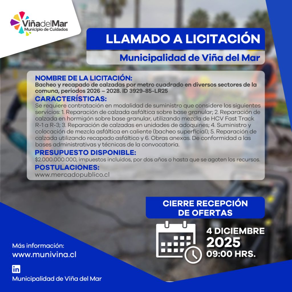 LLAMADO A LICITACIÓN BACHEO Y RECAPADO DE CALZADAS POR M2 VIÑA DEL MAR
