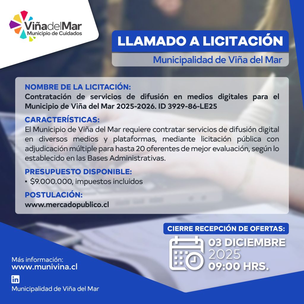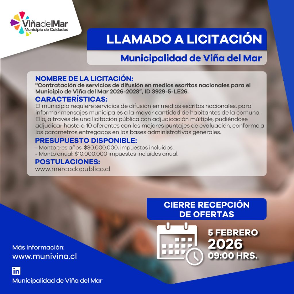 LLAMADO A LICITACIÓN SERVICIO DE DIFUSIÓN EN MEDIOS ESCRITOS PARA LA MUNICIPALIDAD DE VIÑA DEL MAR.