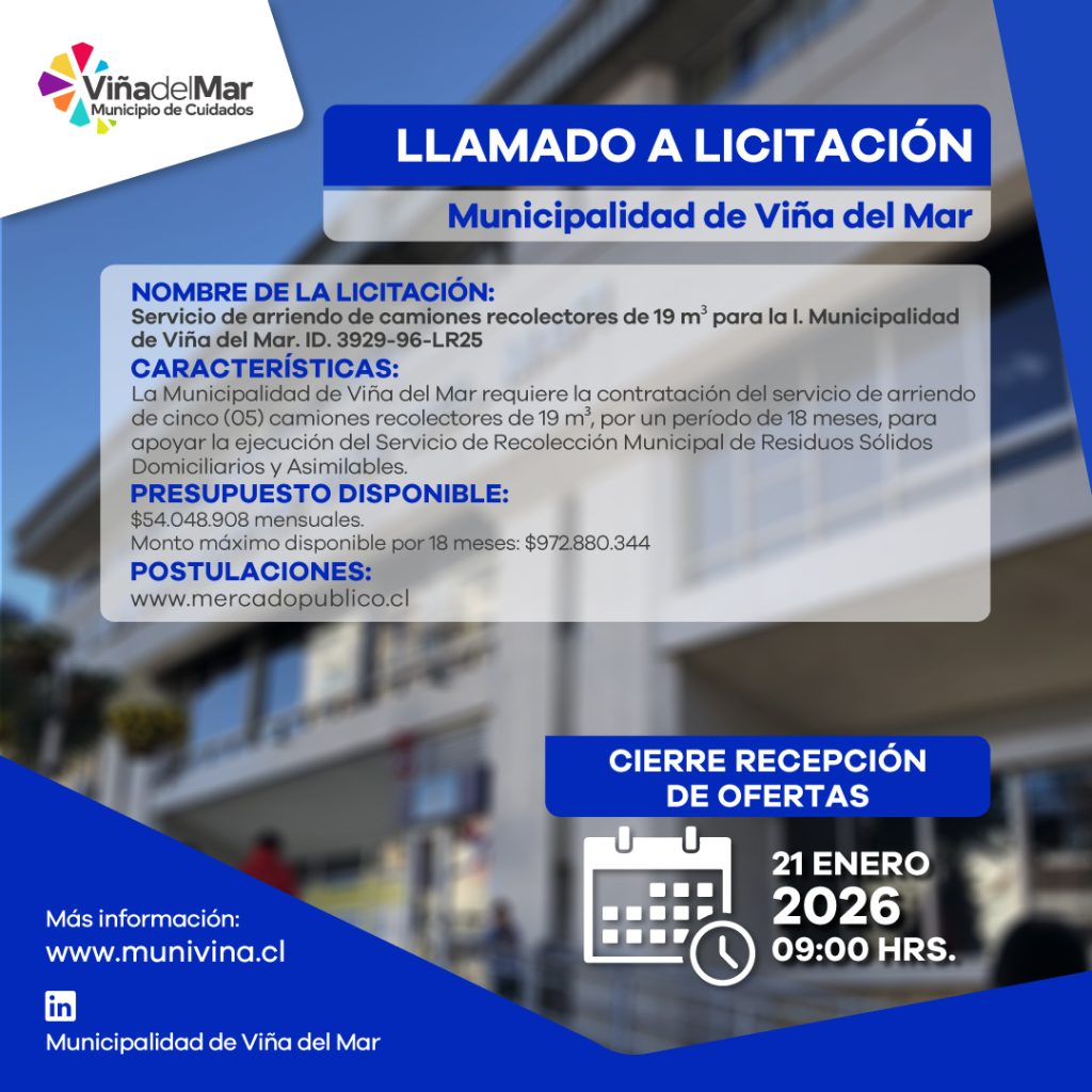 LLAMADO A LICITACIÓN MUNICIPALIDAD DE VIÑA DEL MAR REPOSICIÓN 5 CAMIONES RECOLECTORES DE ASEO DOMICILIARIO.