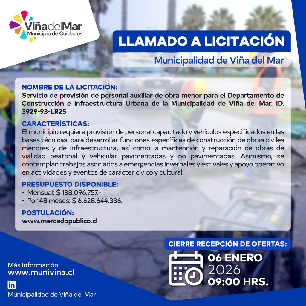 LLAMADO A LICITACIÓN SERVICIO DE PROVISIÓN DE PERSONAL AUXILIAR DE OBRA MENOR PARA EL DEPARTAMENTO DE CONSTRUCCIÓN E INFRAESTRUCTURA URBANA DE VIÑA DEL MAR