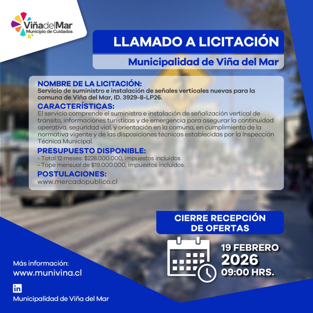 LLAMADO A LICITACIÓN SERVICIO DE MANTENCIÓN REPOSICIÓN Y CONSERVACIÓN DE SEÑALES VERTICALES PARA DIVERSOS SECTORES PARA LA COMUNA DE VIÑA DEL MAR
