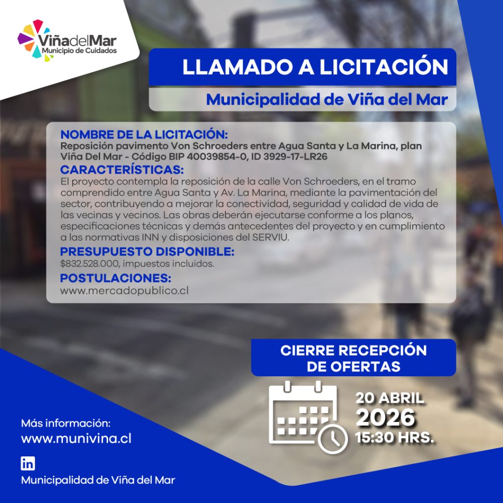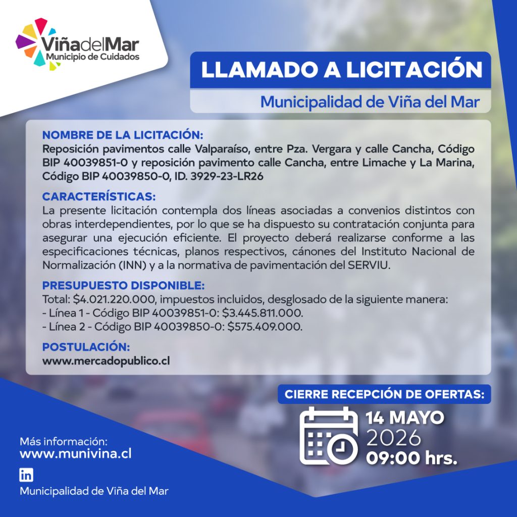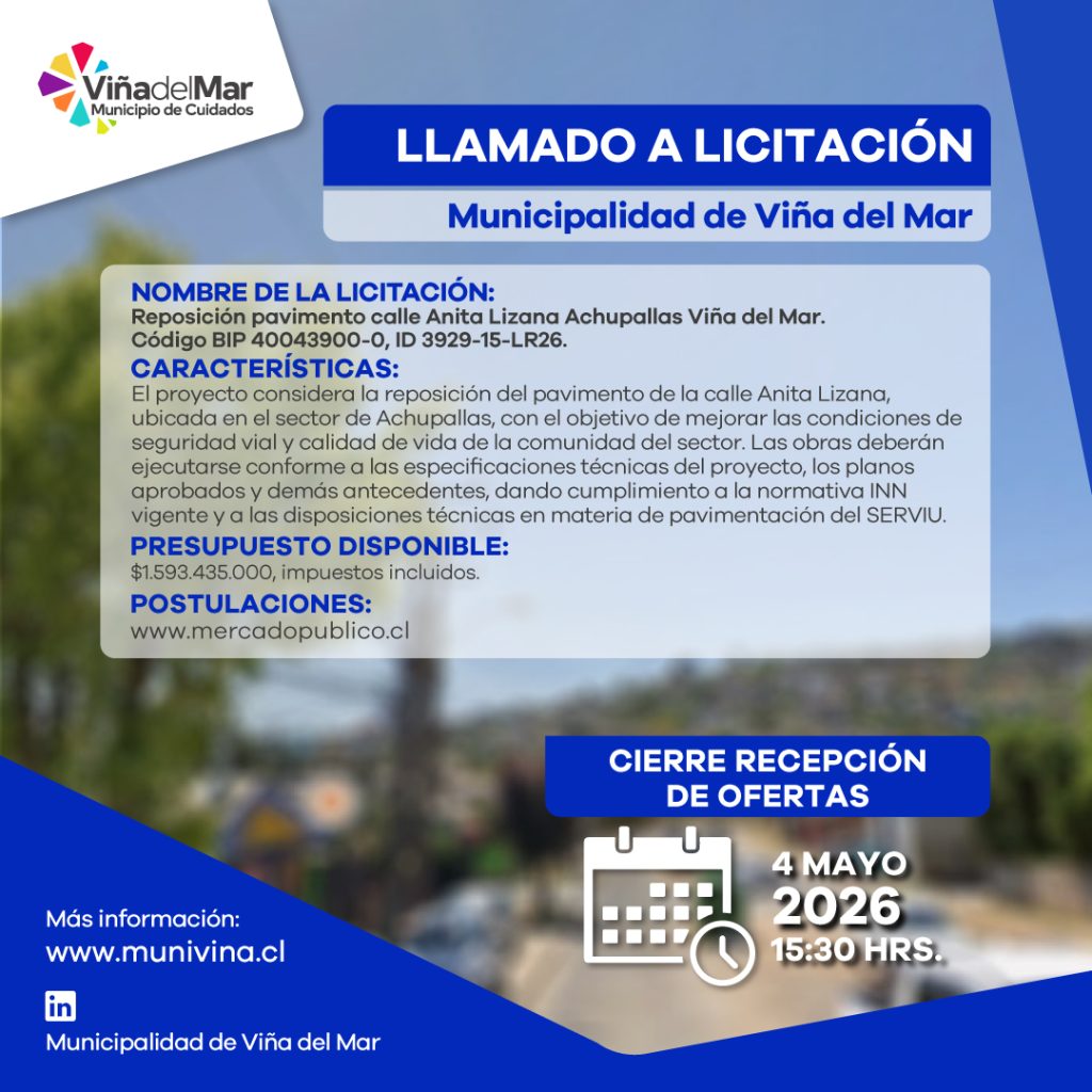LLAMADO A LICITACIÓN BACHEO Y RECAPADO DE CALZADAS POR M2 VIÑA DEL MAR