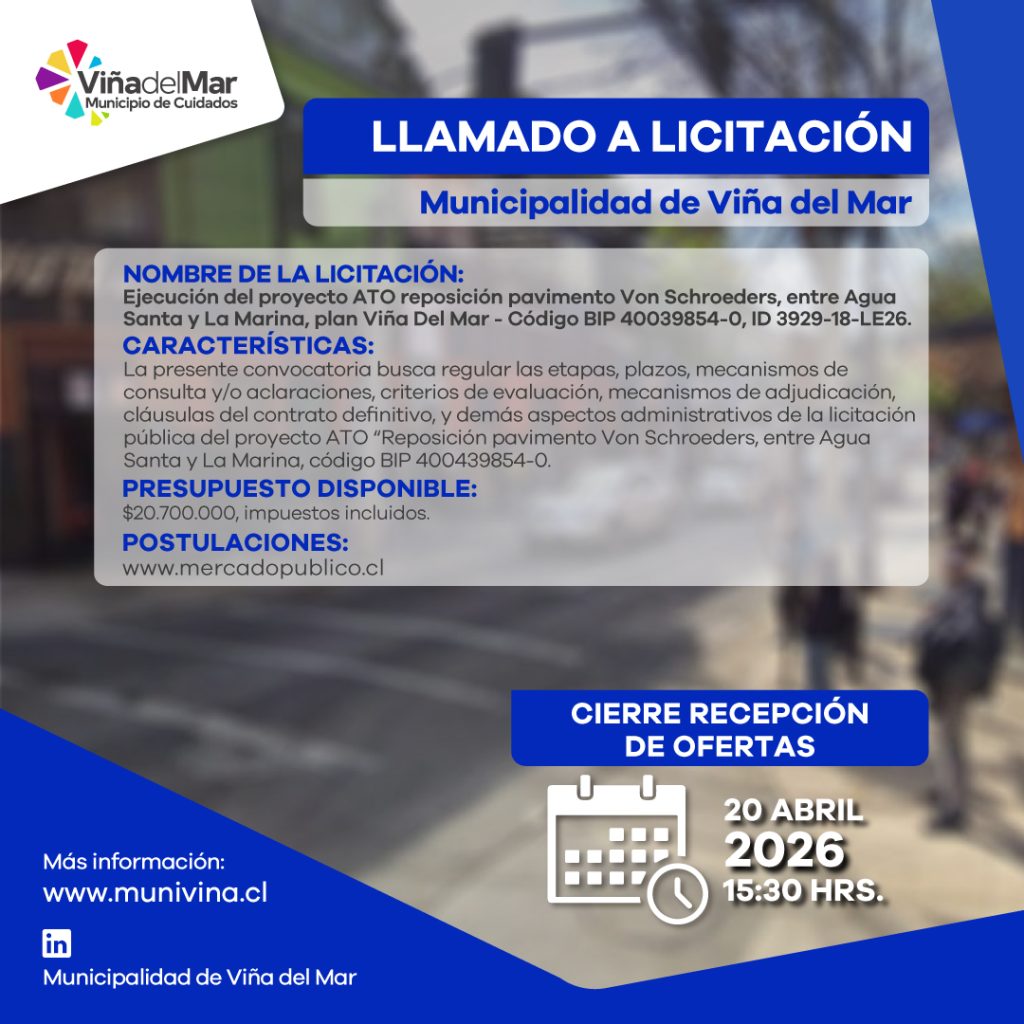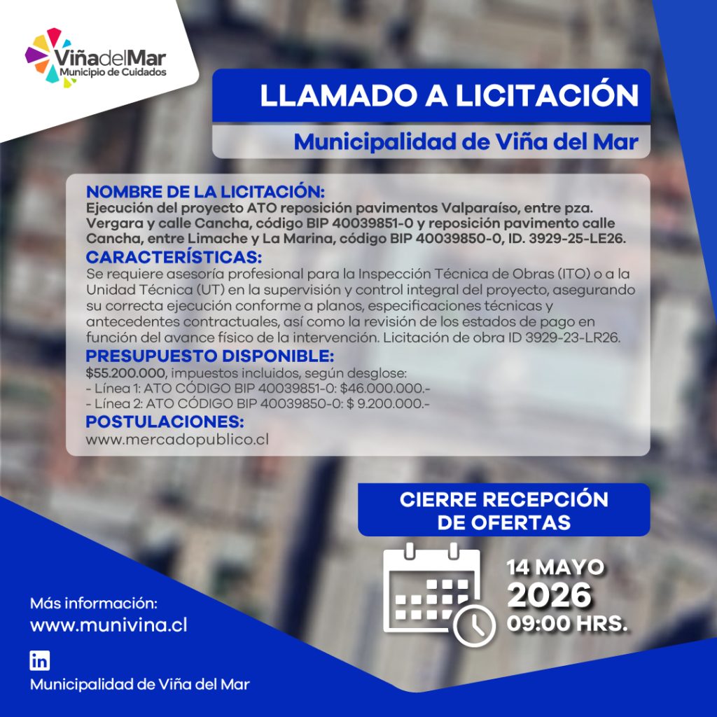 LLAMADO A LICITACIÓN ATO “MEJORAMIENTO CALLE LAGO RIÑIHUE LOS PINOS REÑACA VIÑA DEL MAR”