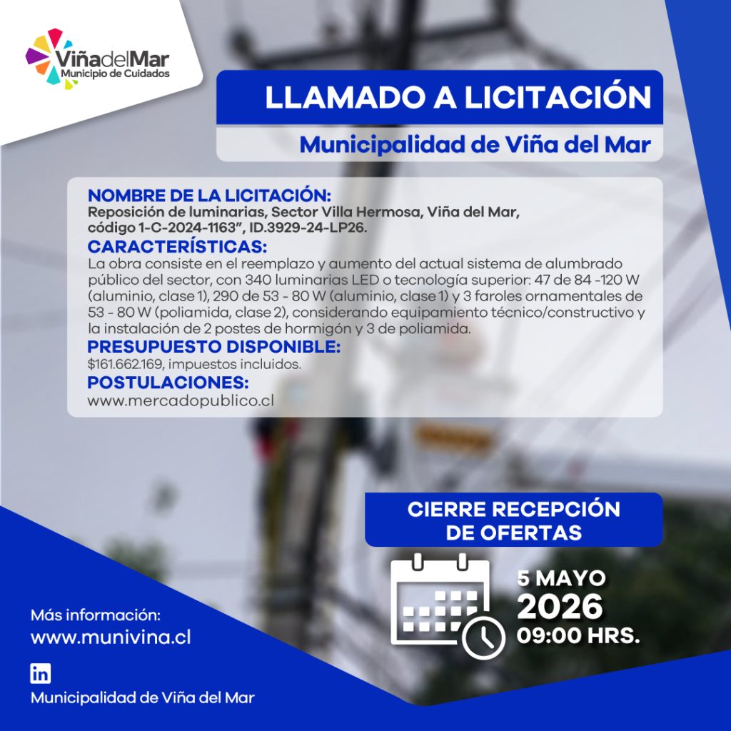 LLAMADO A LICITACIÓN REPOSICIÓN LUMINARIAS LED, AV. LUSITANIA MIRAFLORES BAJO, COMUNA DE VIÑA DEL MAR